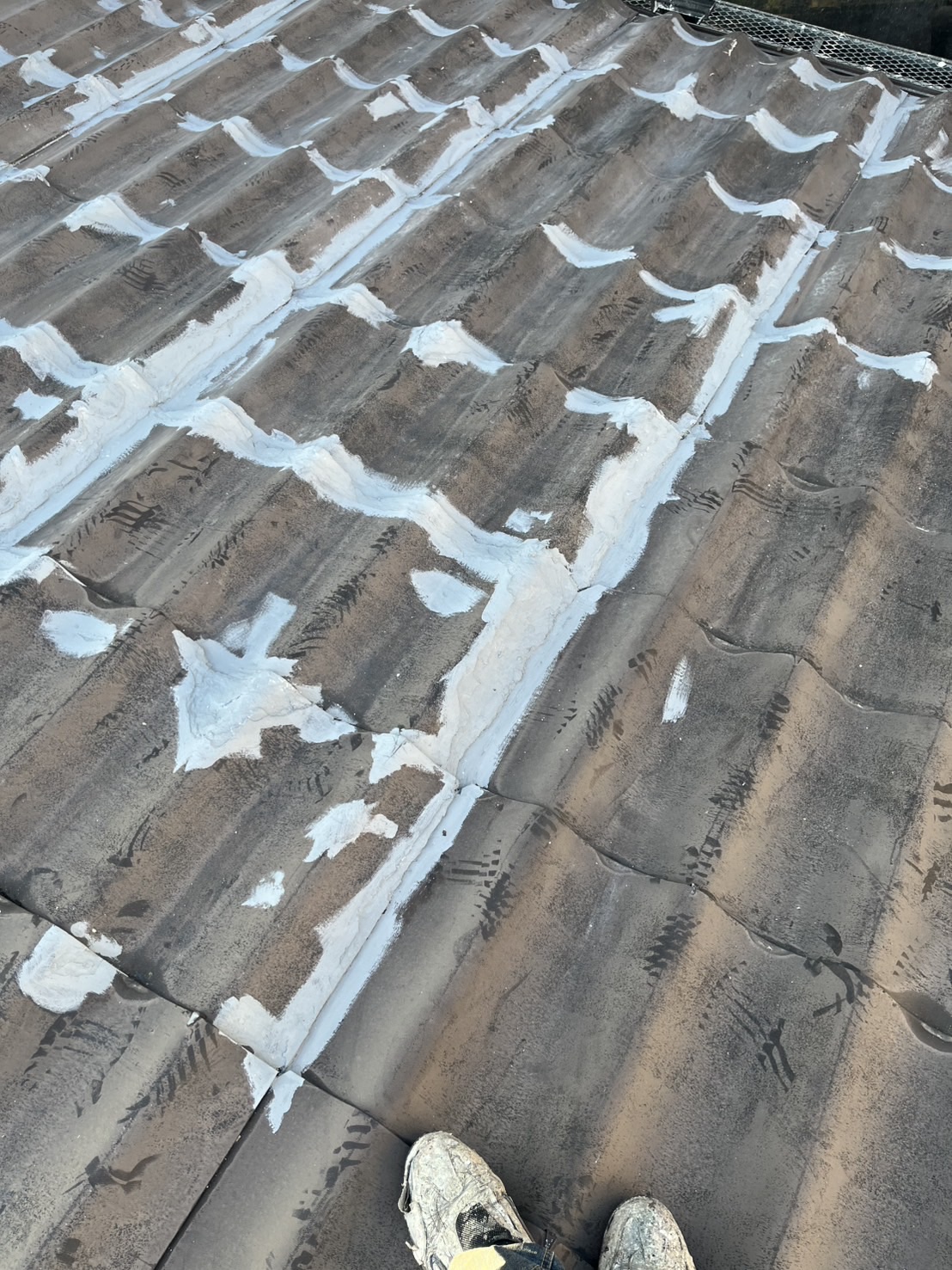 このままじゃ塗れません。兎に角屋根用カチオン系下地材で劣化部を固めました。