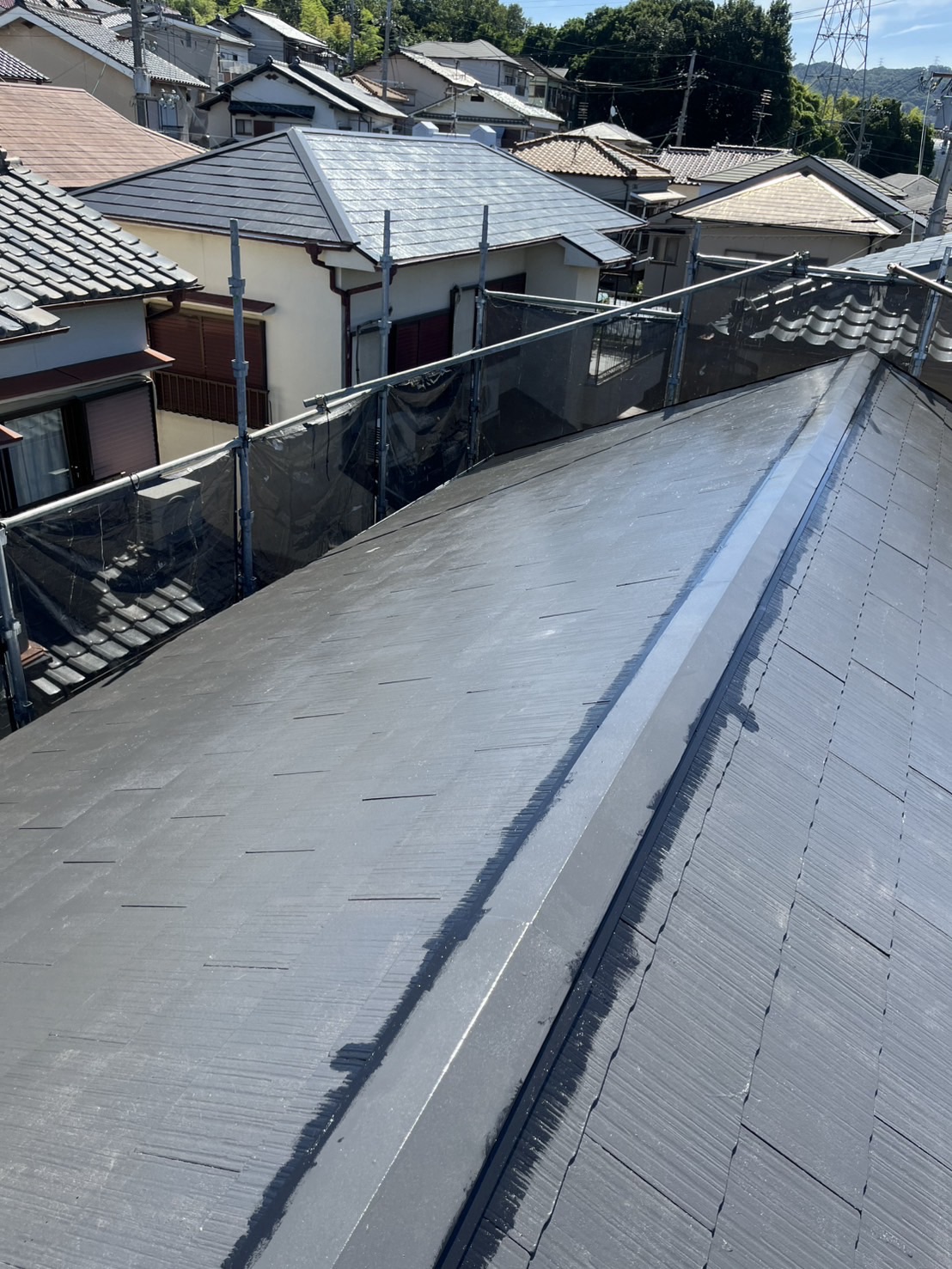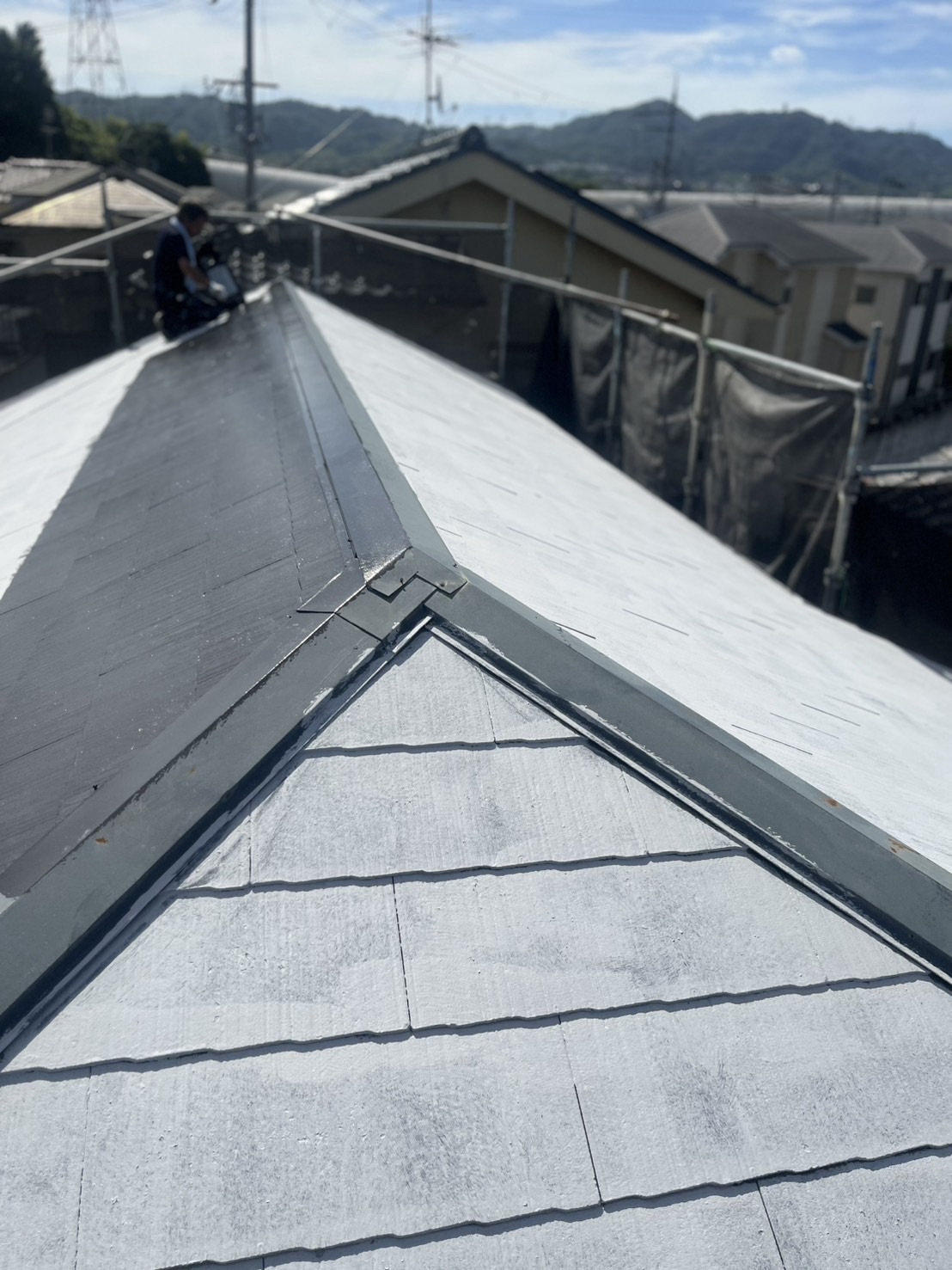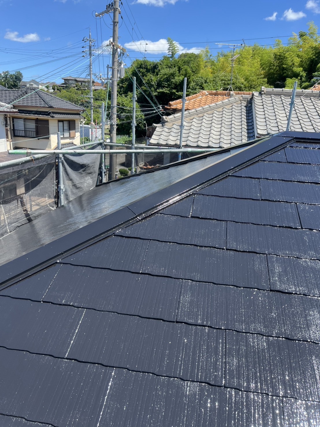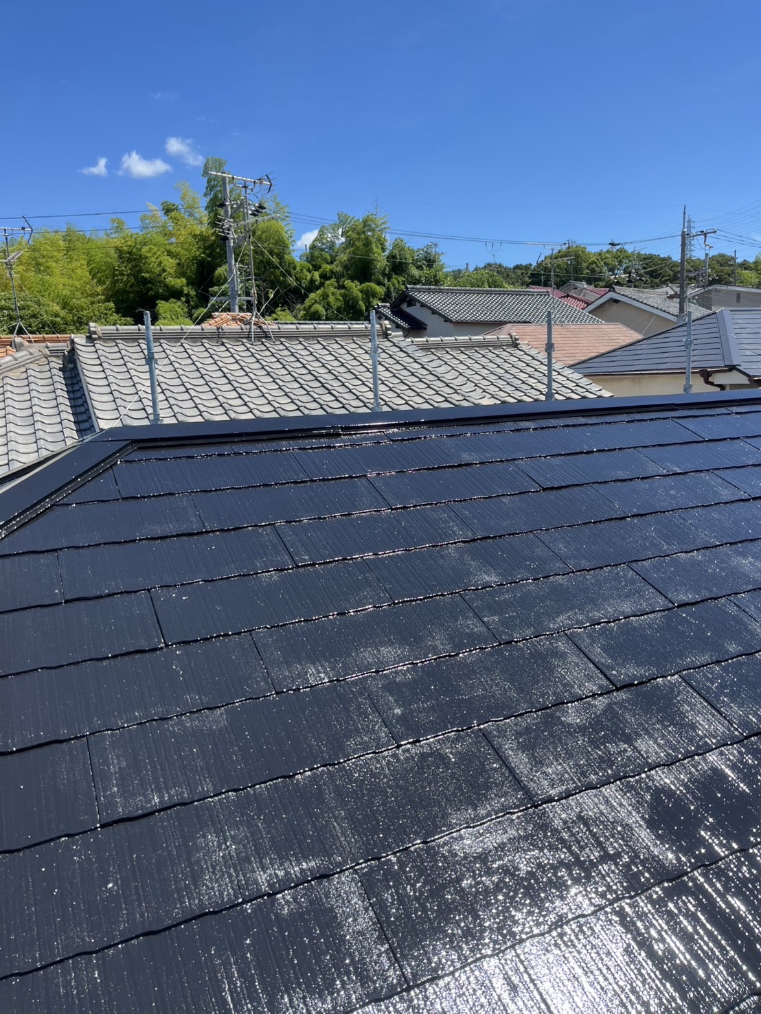 で、厚膜カチオン系のハイブリッドプライマーを塗装後、SK化研プレミアムルーフシリコンを2回塗装しました。